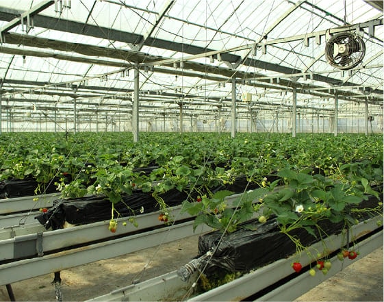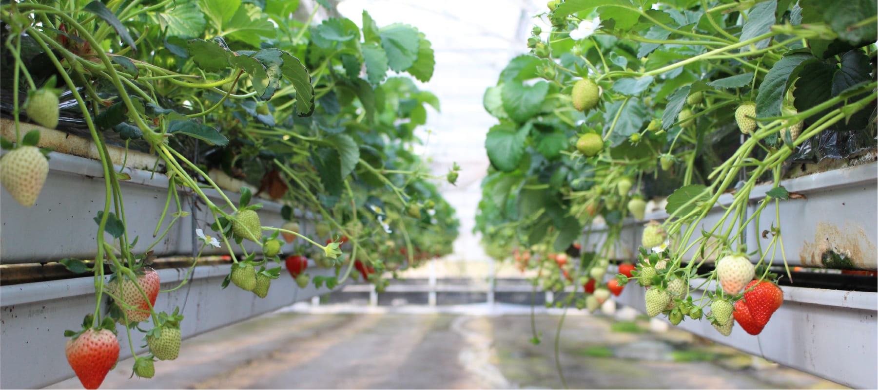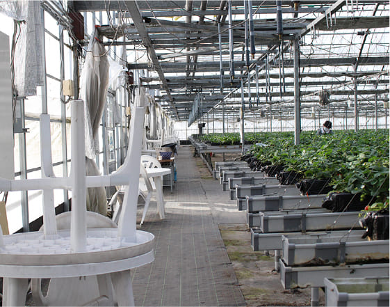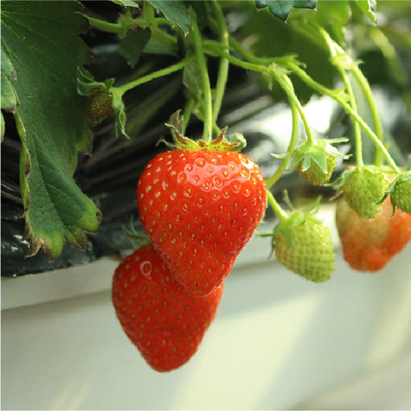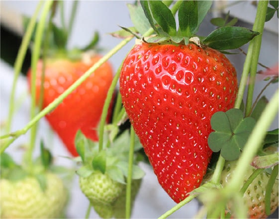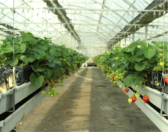 まるでいちごが浮いているような「空中栽培システム」で、いちごが取りやすいのが特徴です。