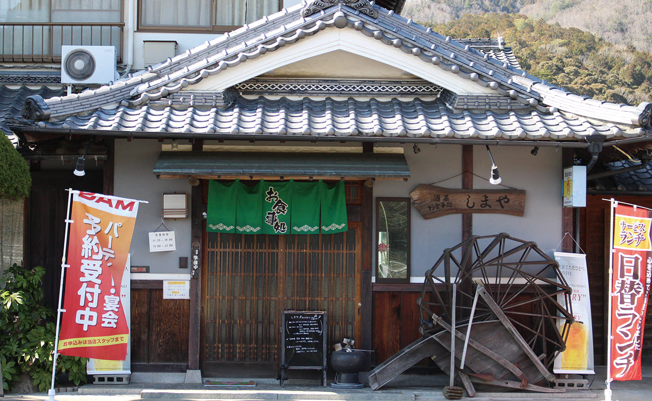 入口の横には、昔使用していたような水車が置かれた趣のある建物。